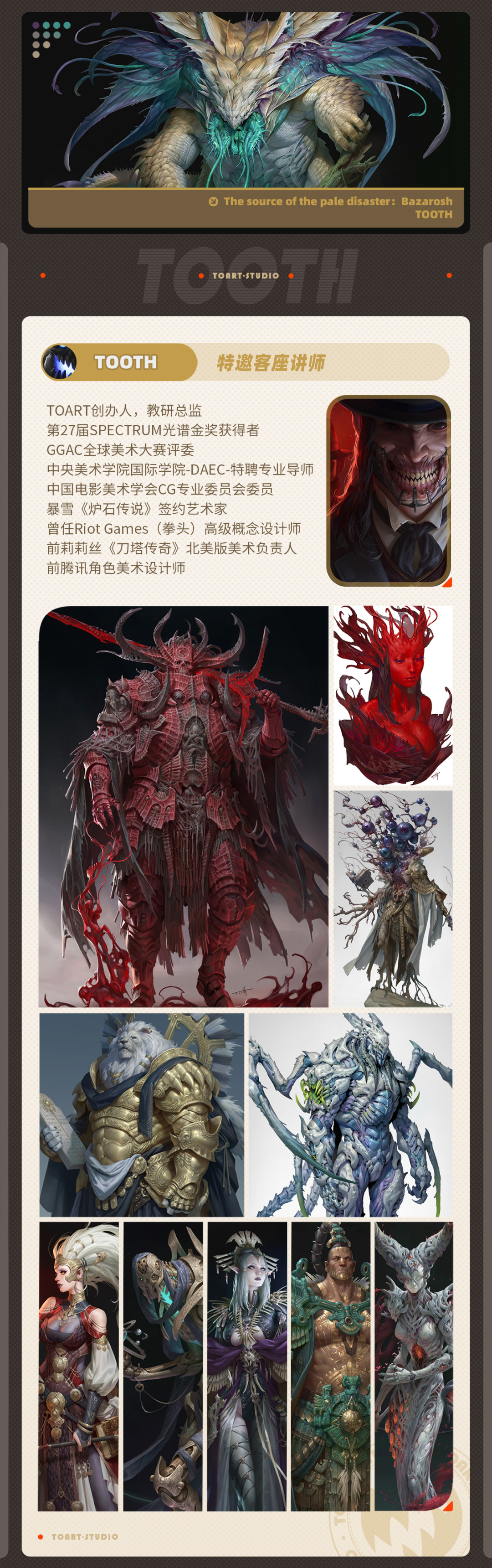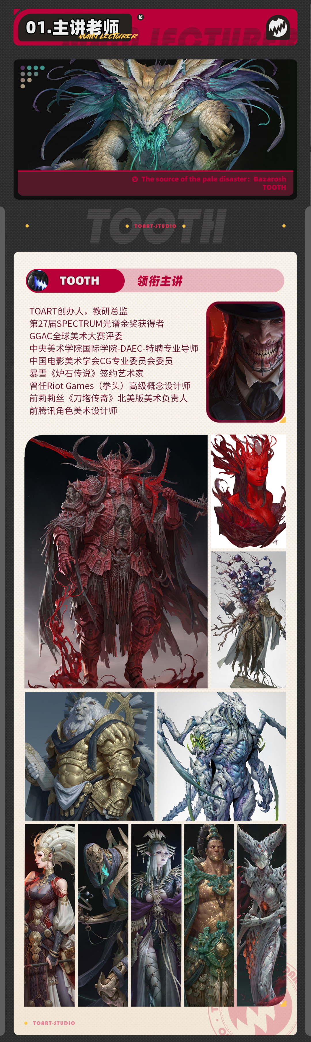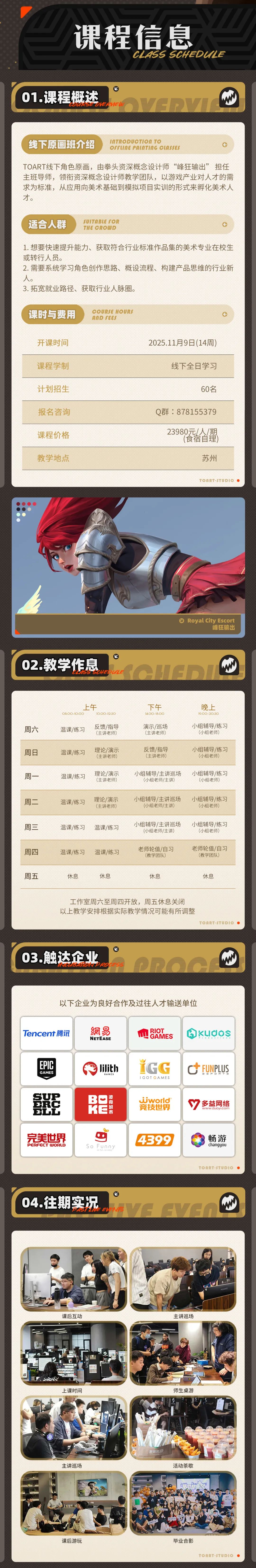 课程概要:16周,TOOTH老师主讲亲理,教学团队全程辅导。全面深化造型能力、系统进阶设计思路与技巧,扩展设计宽度和知识面。打造一套或者数套高完成度、具有趣味与审美、含金量高的原画作品集。